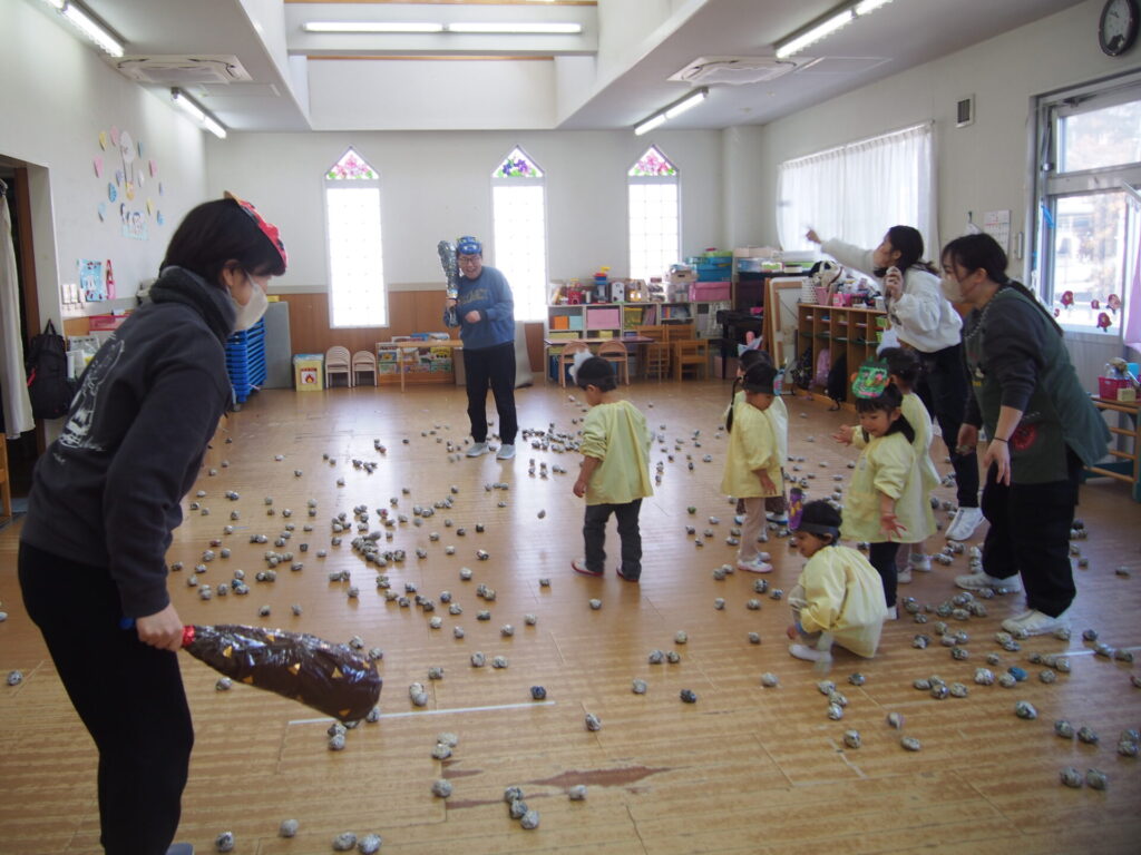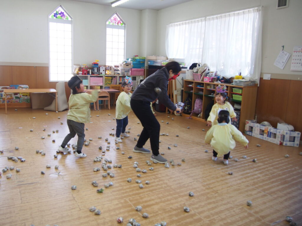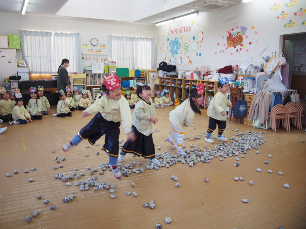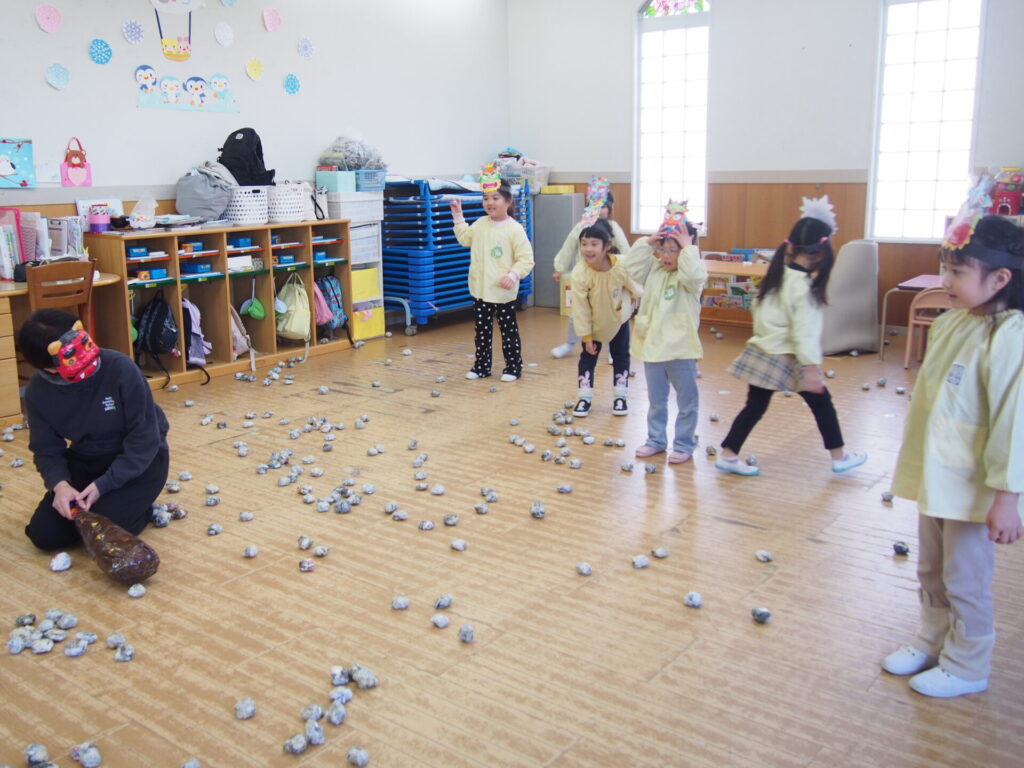 先生から節分についてのお話を聞いた後、鬼に変身してた先生達に向かって新聞紙豆をまいて【体の中の鬼】を退治しました。先生が鬼役だとわかっていてもやっぱり少し怖かったようで、何人か泣いてしまった子もいましたが最後まで一生懸命に頑張る子どもたちの姿が印象的でした。