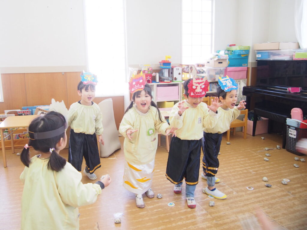 節分の行事を通して、みんなが1年間健康で元気いっぱい過ごせますようにと願いを込めました😊